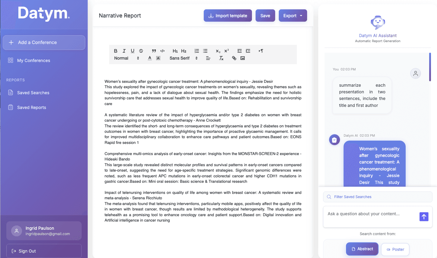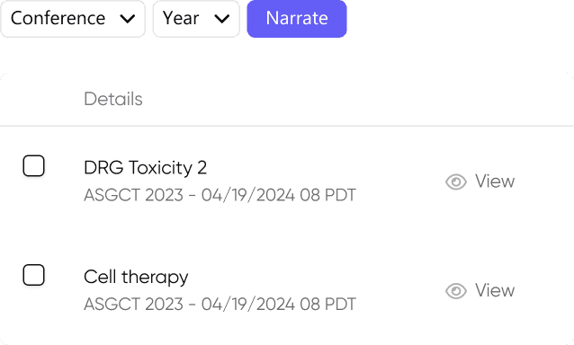 Search abstracts, posters, and recorded sessions to generate a table of relevant presentations and summaries of key data points. Searched can be saved to use as an on site guide for quick reference to key data points at the conference. They can also be imported into the Narrative Report to create summary e-mails or customizable reports that are generated using an AI research assistant that is trained on scientific lexicon.