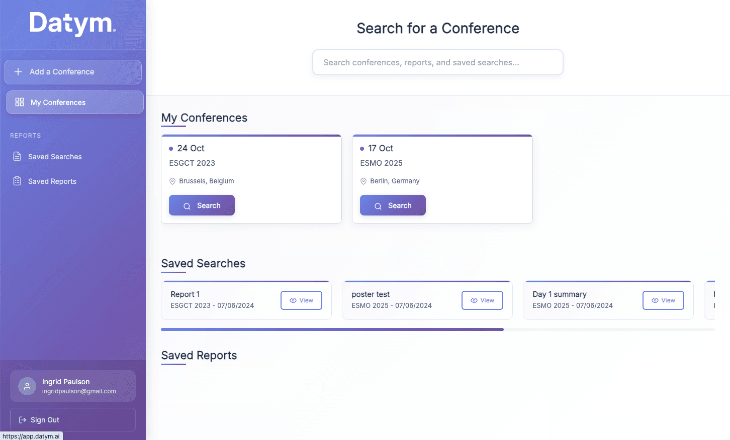 Users can purchase access to individual conferences to automatically and instantly weed through thousands of abstracts to identify and generate summaries of targeted, relevant presentations. Create your schedule of relevant sessions or detailed reports in minutes instead of hours. Search through days of recorded sessions in moments to find the exact timestamp of the presentation or relevant data you and your stakeholders need.